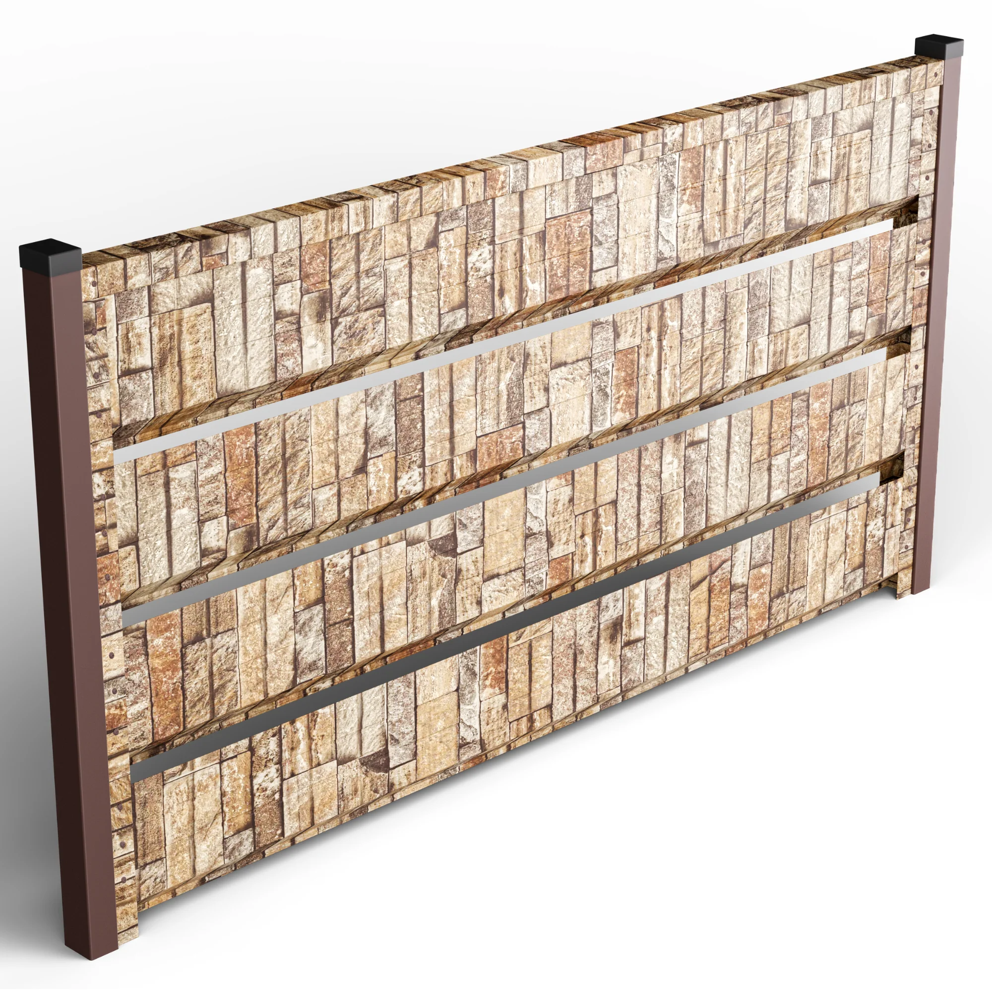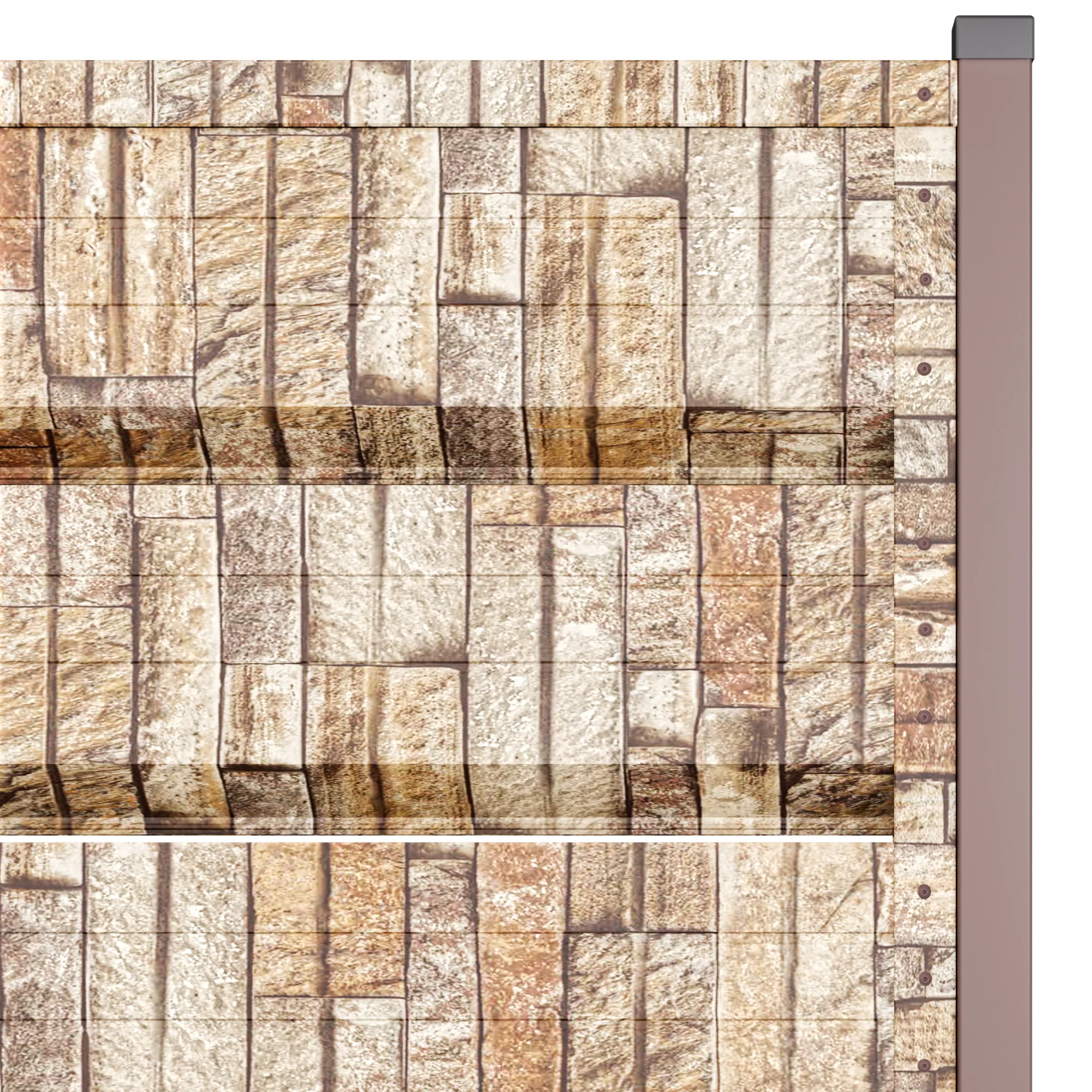 Gardul este realizat din tablă de oțel galvanizat, prelucrată cu un strat dublu de zinc și acoperită cu un finisaj polimeric imprimat digital. Tehnologia de printare oferă o textură vizuală realistă, ce reproduce fidel aspectul unui zid de piatră naturală – fără greutatea și costurile ridicate asociate acestuia.
