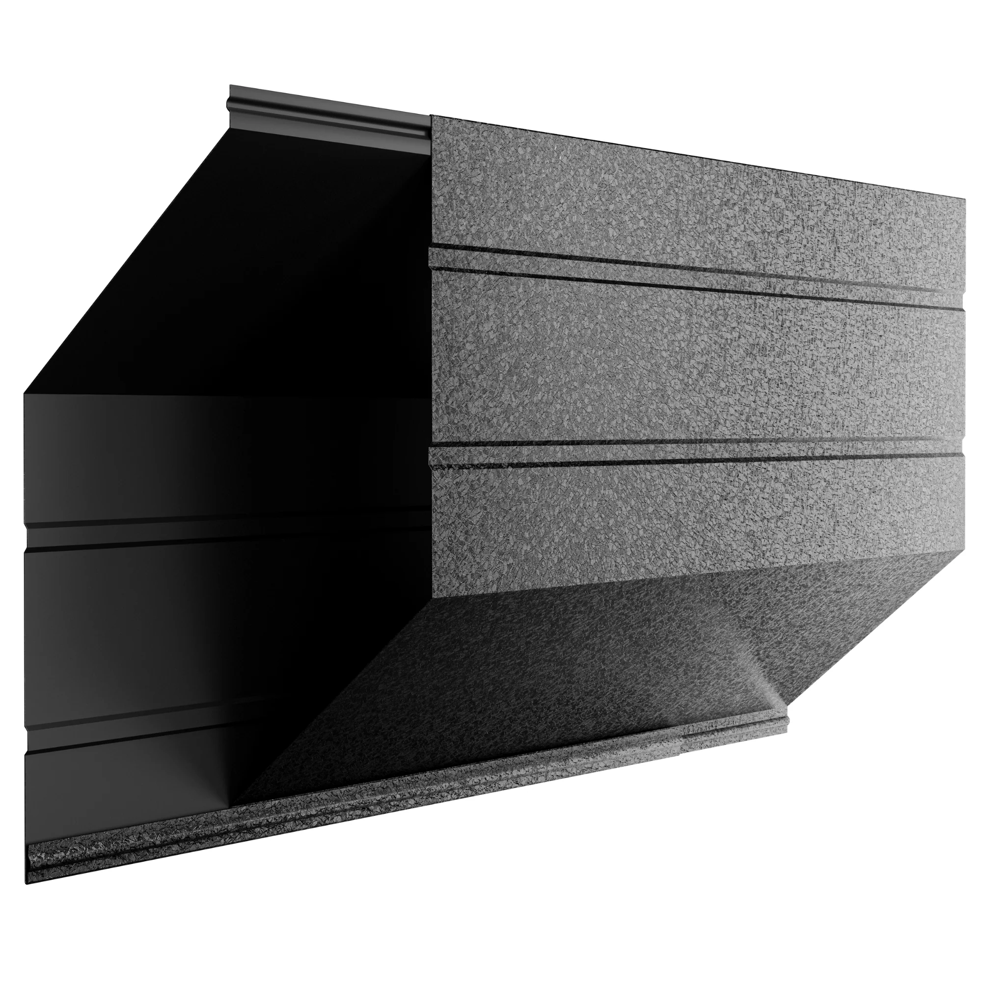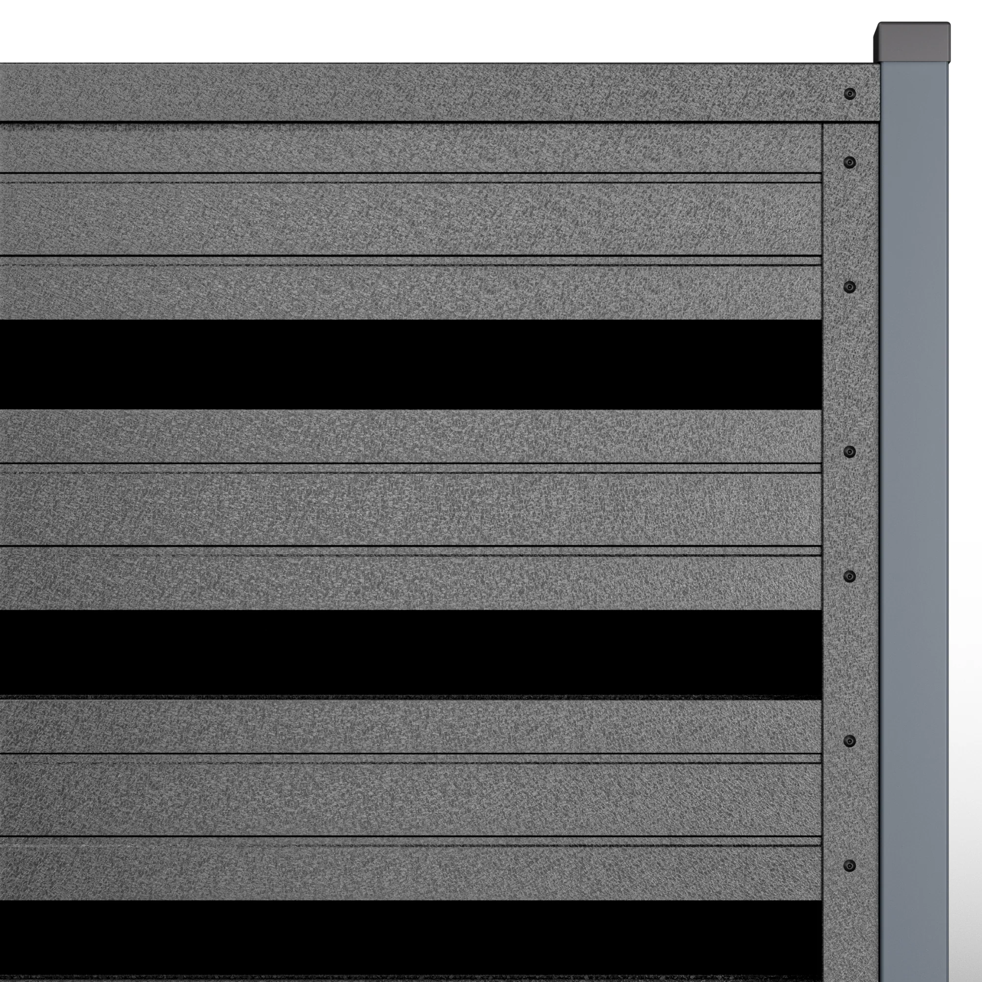 Gardul orizontal Romb Max în nuanța Negru de Noapte este fabricat din tablă de oțel galvanizată, dublu zincată și pre-vopsită cu strat protector de polimer, ceea ce îi conferă o durabilitate excepțională în orice condiții climatice. Grosimea tablei este de 0.45 mm, iar finisajul este mat, aplicat uniform pe ambele fețe, în nuanța profundă Negru de Noapte – o culoare intensă, elegantă, potrivită pentru proiecte cu un design sobru, modern sau industrial. Panourile sunt livrate cu toate componentele necesare montajului: profiluri casetate, profiluri „U” verticale și superioare, pop-nituri, șuruburi, dibluri, colțare de prindere, distanțiere și, dacă este cazul, profil întăritor pentru panourile mai lungi.
