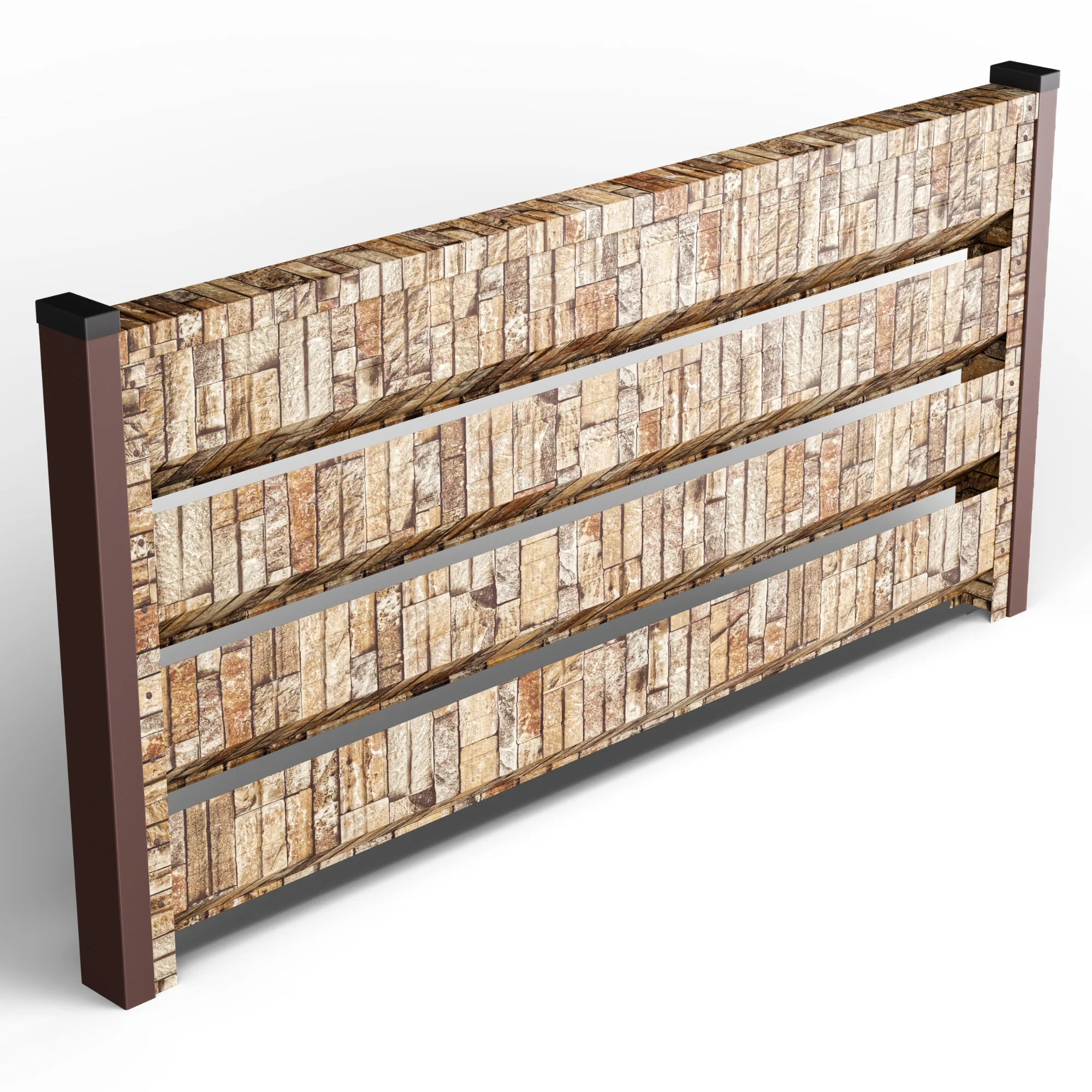 Se poate combina estetic cu stâlpi vopsiți în tonuri de gri, alb, negru mat sau chiar cu profile metalice texturate. Aspectul final este impunător, dar echilibrat.