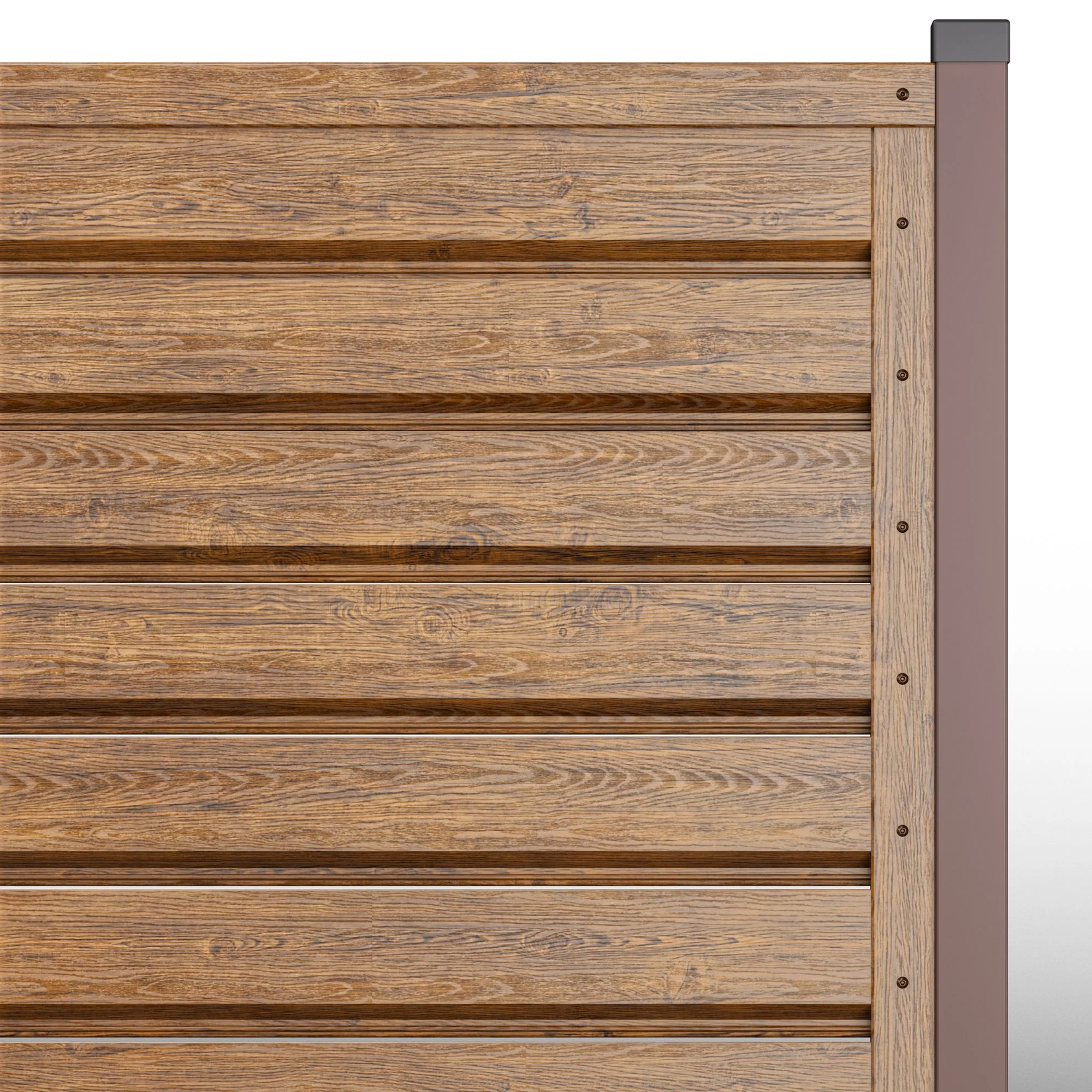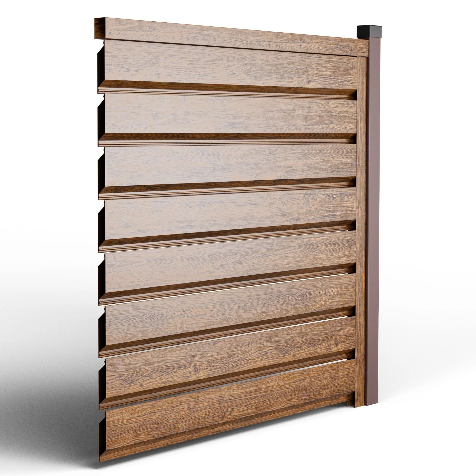 Modelul este realizat din tablă de oțel galvanizat cu grosime de 0.45 mm, cu protecție completă împotriva coroziunii – zinc pe ambele fețe și acoperire cu vopsea polimerică, nuanțată în fabrică în tonuri realiste de Nuc. Panourile sunt formate din lamele de tip casetă, fiecare având înălțimea de 113 mm. Vopsirea în câmp electrostatic asigură o aderență perfectă și o rezistență sporită la UV, îngheț, ploi acide și alți factori agresivi de mediu. Materialul de bază provine din Coreea de Sud, iar garanția tehnică poate ajunge până la 30 de ani, în funcție de montaj și condiții de utilizare.